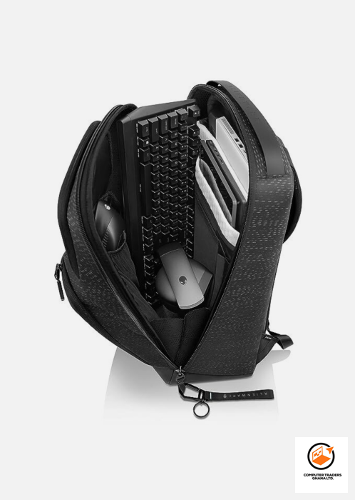 . It is designed to accommodate laptops up to 17 inches. . The backpack is constructed with durable, weather-resistant Galaxy weave fabric. . It features multiple compartments for organizing Laptop, gaming gear, accessories, and personal belongings. . The design includes 360° EVA foam cushioning for enhanced protection against bumps and shocks.