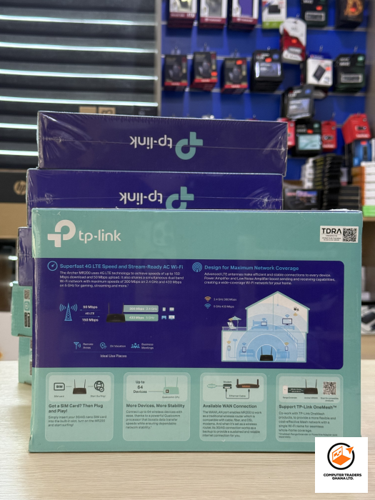 *TP LINK Archer MR200 SIM Router* _AC750 Dual Band Wi-Fi_ _(300Mbps + 433Mbps up to 5GHz)_ ▪︎ Connect up to 64 devices with ease ▪︎ 2 Detachable LTE Antennas for Better Performance ▪︎ Factory Unlocked to all networks (UNIVERSAL) ▪︎ *Mobile App* for easy management ▪︎ LTE: Download Speed 150 Mbps + Upload Speed 50 Mbps ▪︎For smartphones, Laptops 👩💻, CCTV cameras, and other