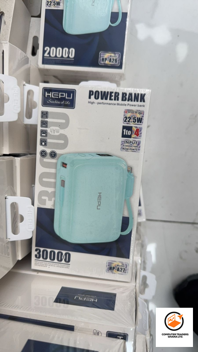HEPU 30,000mAh Super Power Bank (Model: HP-A27) Stay powered all day with this high-performance HEPU power bank. ✅ 30,000mAh ultra capacity ✅ Fast charging up to 22.5W 🔥Qualcomm 3.0 Quick Charge PD⚡️ ✅ Type-C, USB & Lightning outputs ✅ LED digital power display ✅ Smart multi-protection and high-efficiency performance 🟢Green&Intelligent energy products 🟢No memory effects/ Damage on your phone battery ✅ Includes 1-4 cable (Type-C, iPhone, Micro USB) Perfect for phones, tablets, and smart accessories.