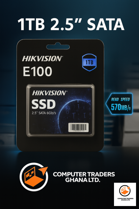 1TB SATA SSD HIKVISION E100 2.5” 6Gb/s Solid State Drive General Specifications: • Capacity: 1TBGB • Form Factor: 2.5-inch • Interface: SATA III 6Gb/s • NAND Type: 3D NAND TLC Performance: • Sequential Read Speed: Up to 550 MB/s • Sequential Write Speed: Up to 450 MB/s • Random 4K Read IOPS: Up to 60,000 • Random 4K Write IOPS: Up to 70,000 • Warranty: 3-year limited warranty This SSD is suitable for enhancing the performance of laptops and desktops that support 2.5-inch SATA storage, offering a significant speed boost over traditional hard drives.