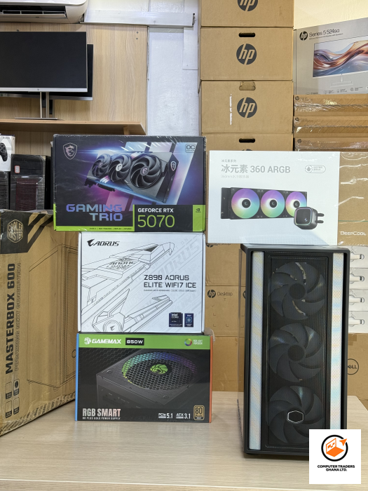 💻 GIGABYTE AORUS ELITE CUSTOM GAMING PC • CPU: Intel® Core™ Ultra 9 285K Processor (24 Cores, up to 5.7GHz) • RAM: 64GB Corsair RGB DDR5 6000MHz (Expandable to 128GB) • Storage: 3TB Kingston NV3 PCIe 4.0 NVMe SSD • GPU: MSI GeForce RTX™ 5070 GAMING TRIO OC 12GB GDDR7 • Motherboard: Gigabyte Z890 AORUS ELITE WIFI 7 ICE (Wi-Fi 7, BT 5.4, PCIe 5.0) • Cooling: 360mm ARGB Liquid Cooler • PSU: GameMax 850W 80+ Gold RGB Smart Power Supply • Case: Cooler Master MasterBox 600 RGB (Tempered Glass, USB-C 3.2 Gen 2) Upgrades: Extra RAM, M.2, and HDD slots available
